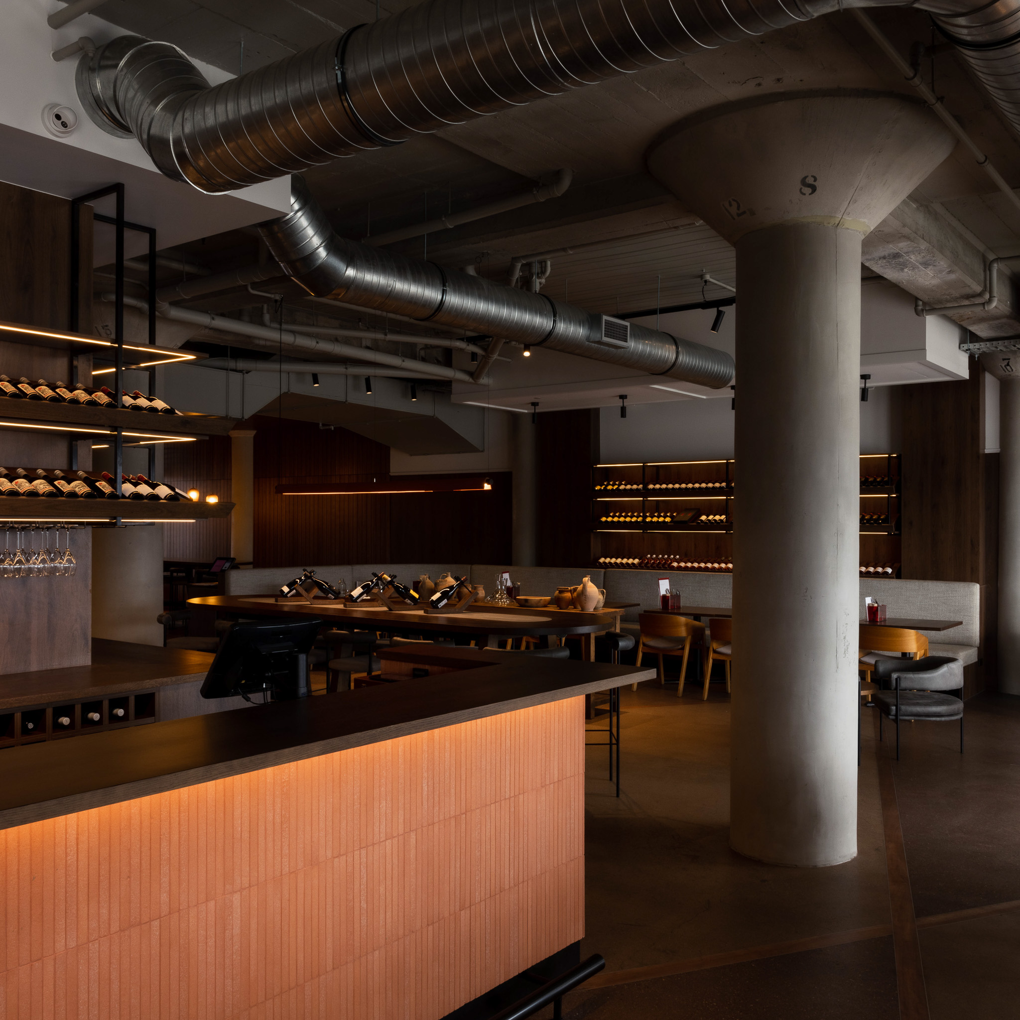 Drawing from the building's industrial history, heritage features have been retained and enhanced in the making of Somm. The original concrete ceilings and pillars have been exposed & restored, revealing the layers of history and to keep the integrity of the building.