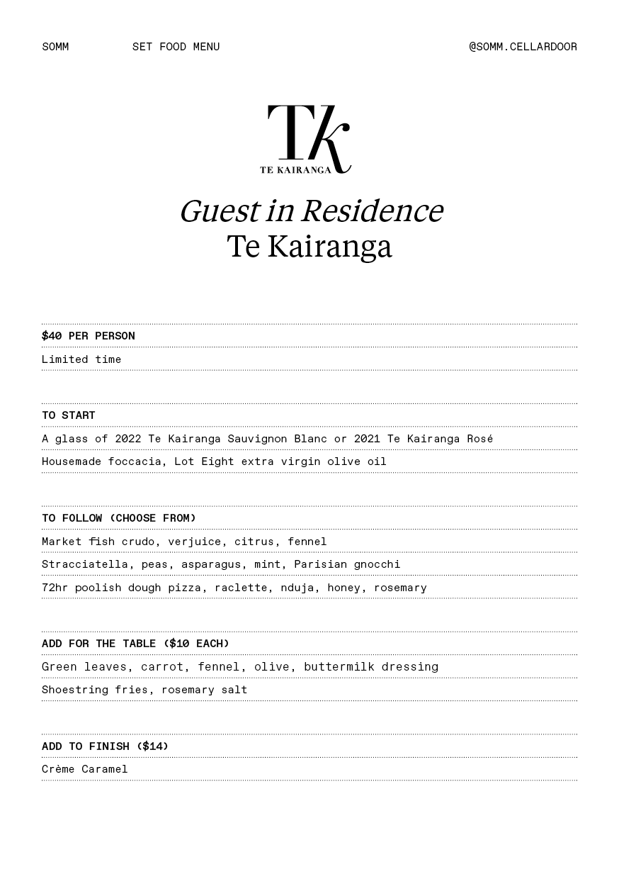 Celebrate our Guest in Residence series with a special set menu created with Te Kairanga winery in mind.